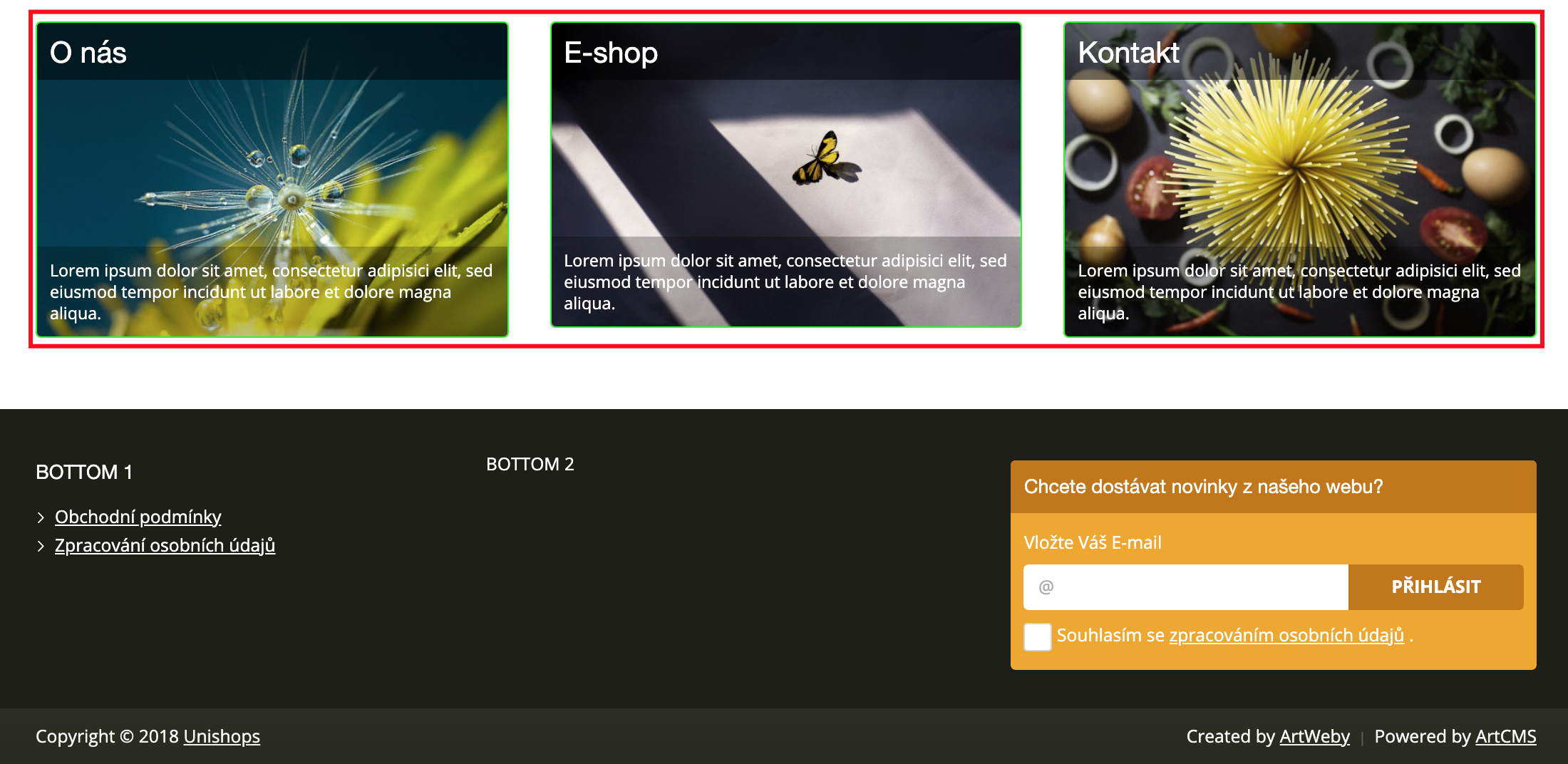 - seznam bannerů v těle úvodní stránky (O nás, E-shop, Kontakt, ...)